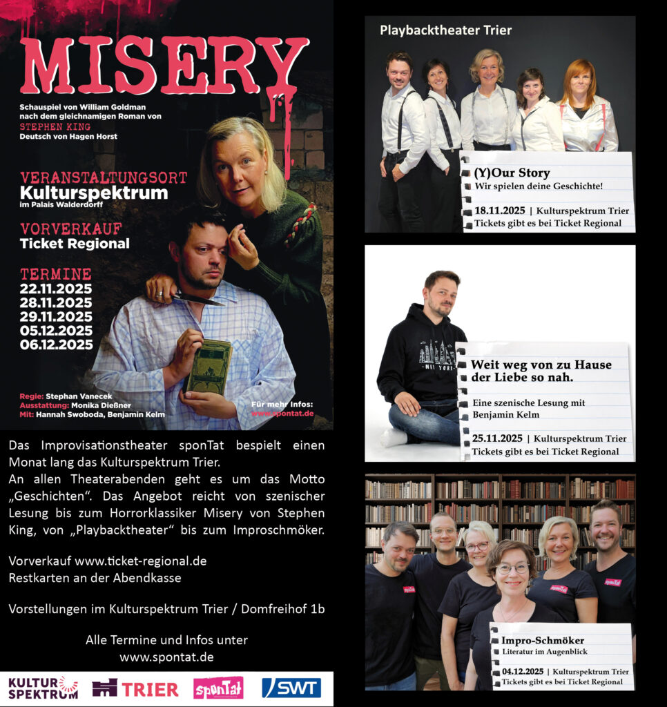Alle Aufführungen finden im Kasino Kornmarkt Trier statt. Einlass jeweils ab 18.30 Uhr, Beginn um 19.30 Uhr. Die Karten kosten 15,00 Euro und können über info@spontat.de reserviert werden.